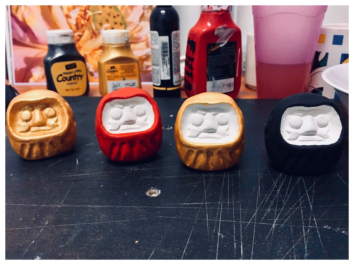 Estas muñecas Daruma de yeso son el resultado de pruebas con moldes de silicona realizados con originales de arcilla.